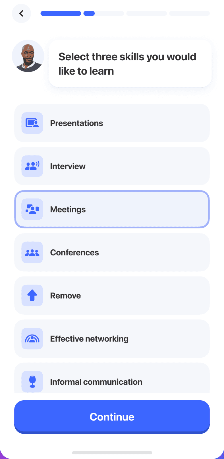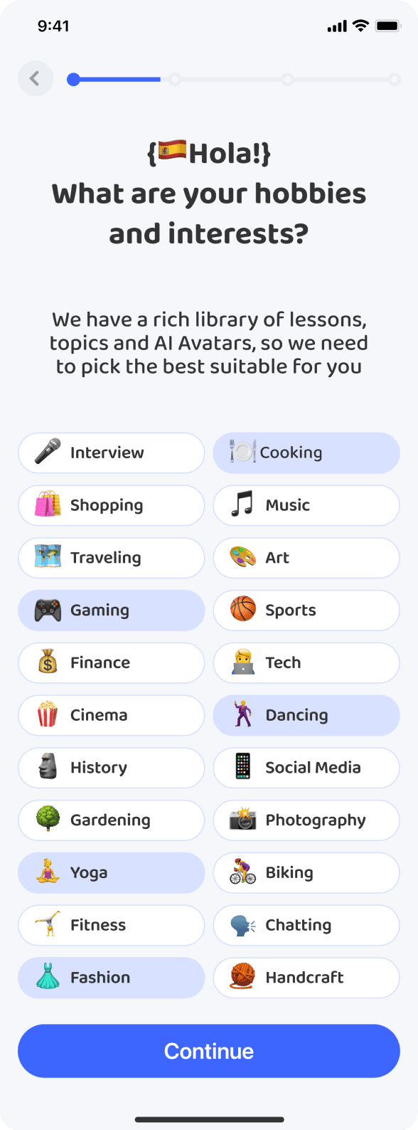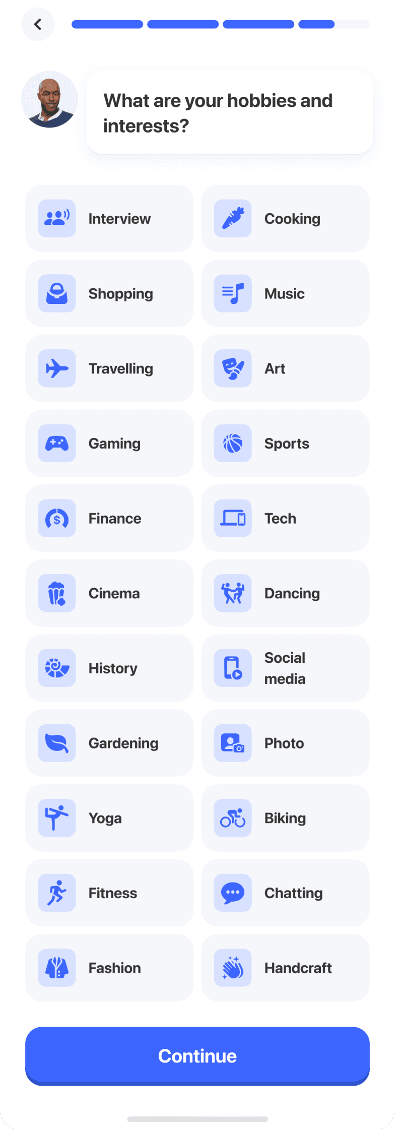 Экран с интересами был переработан: эмодзи заменили на иконки, а лишний текст убрали.