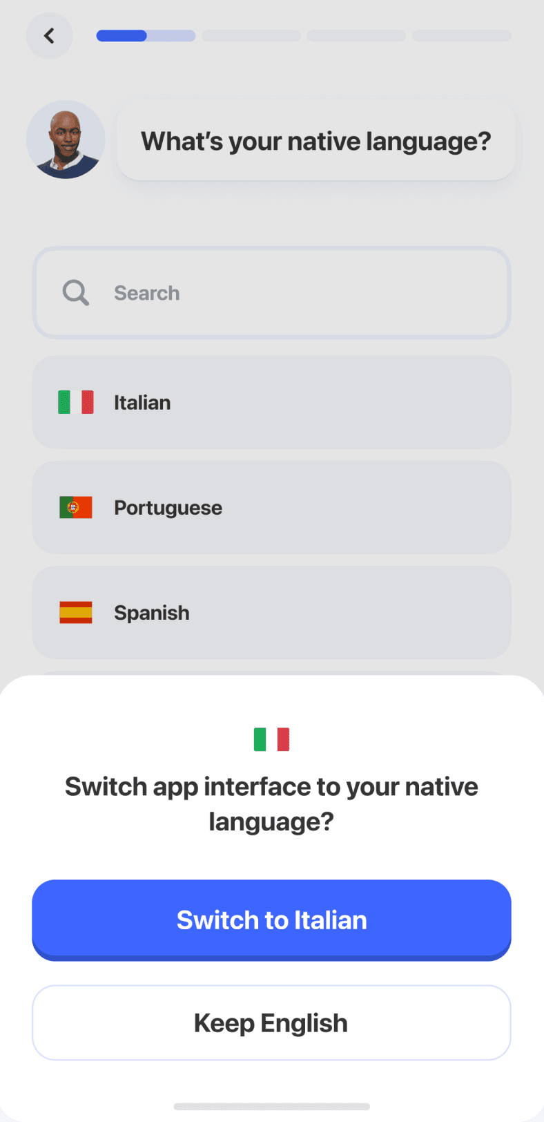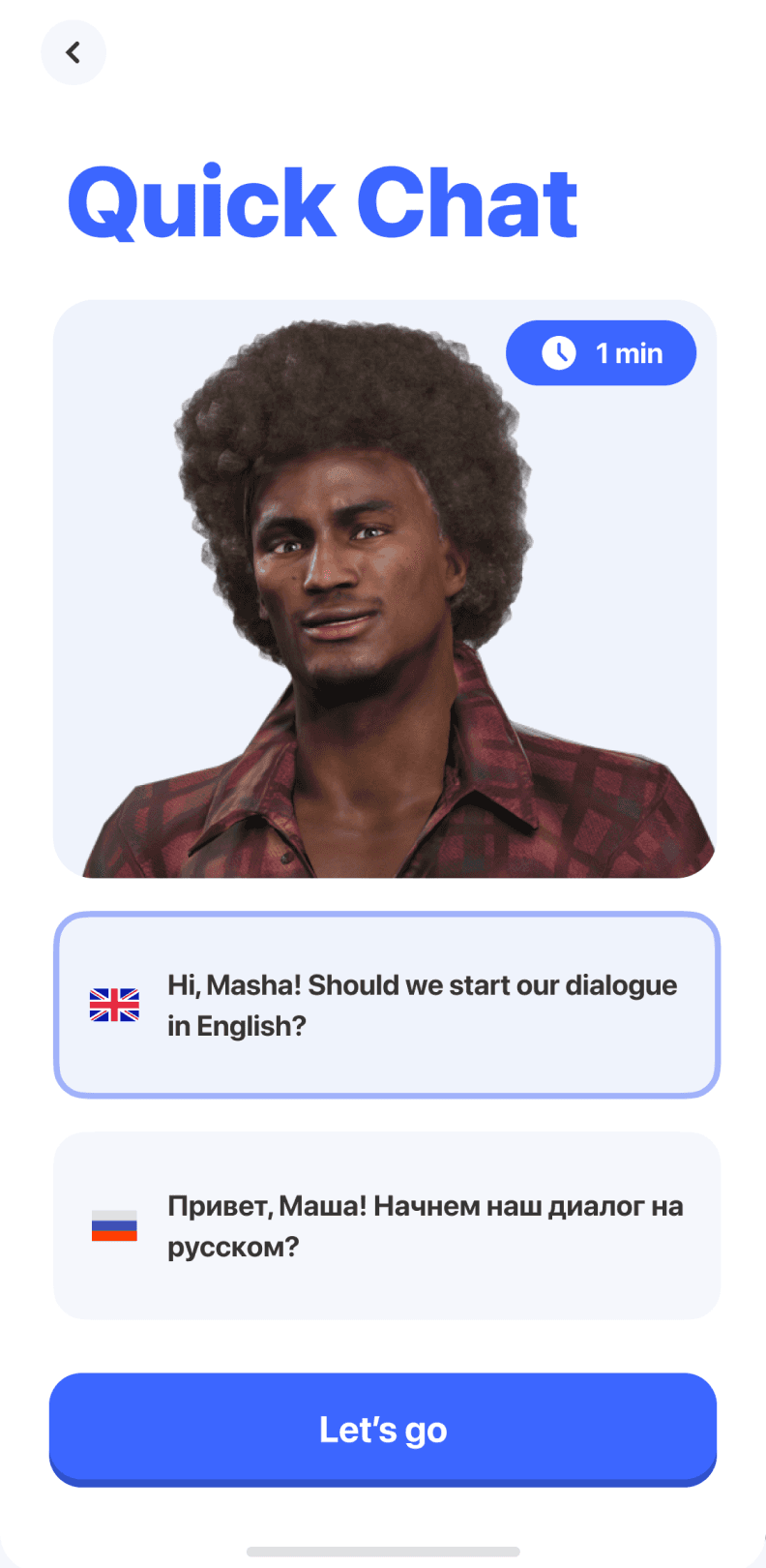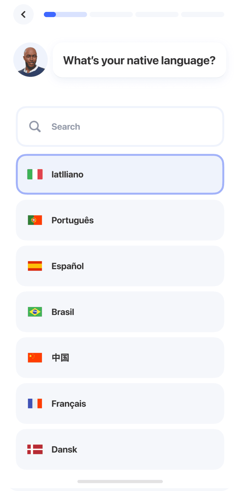 В начало онбординга был добавлен шаг с выбором нативного языка и возможностью переключить интерфейс. Это позволило снизить порог входа для пользователей, которые ещё не владеют английским,