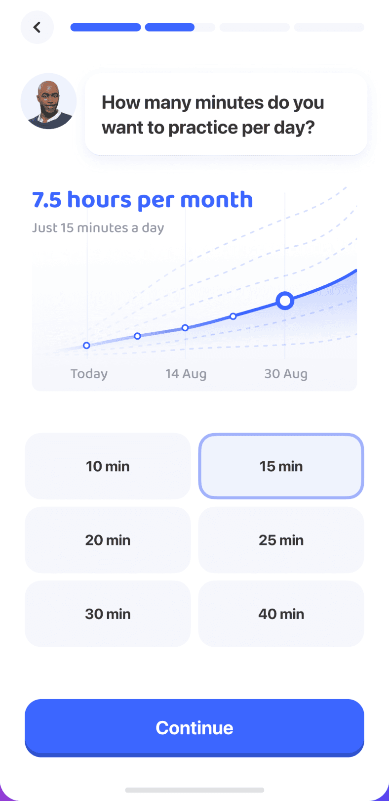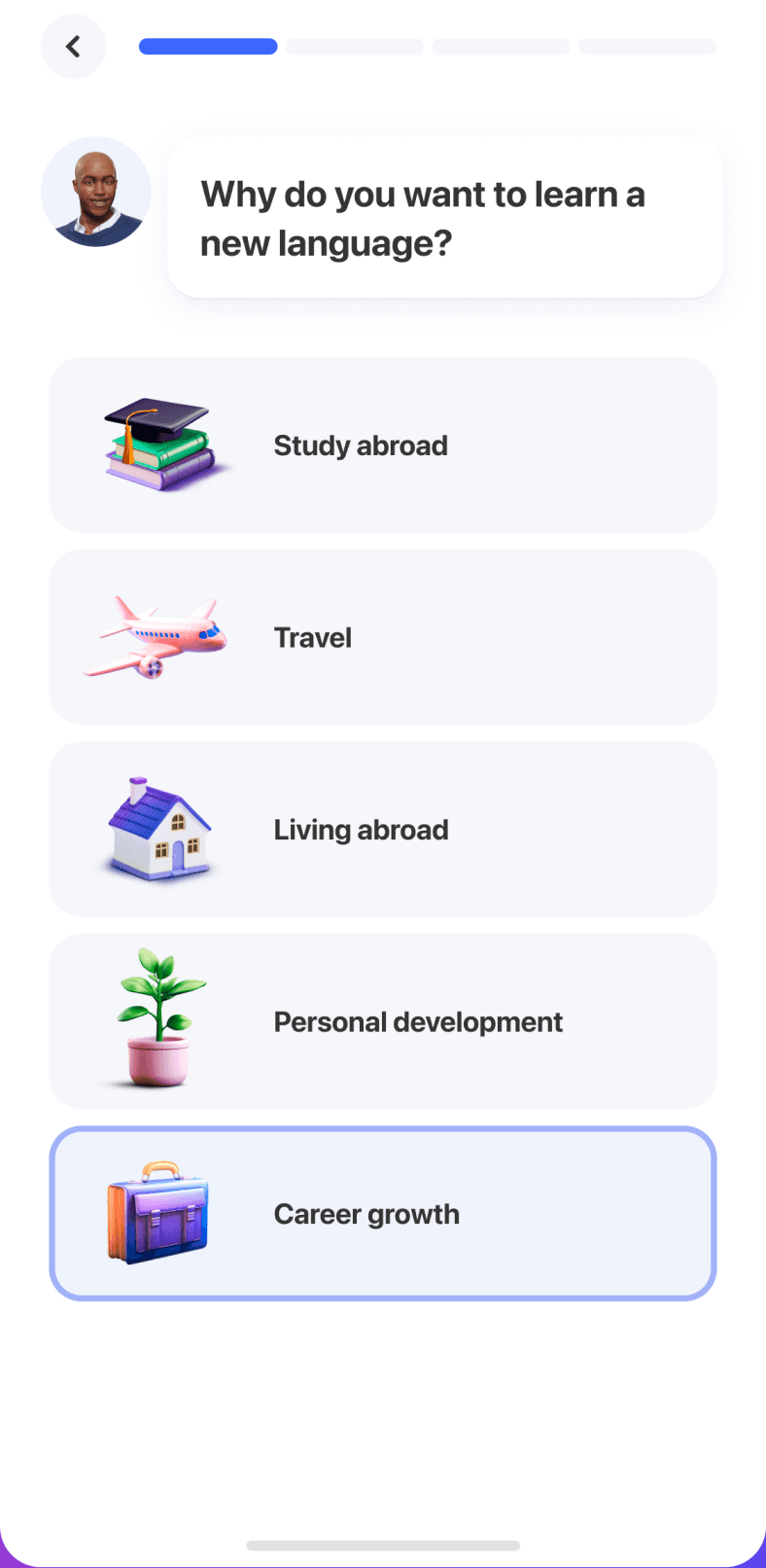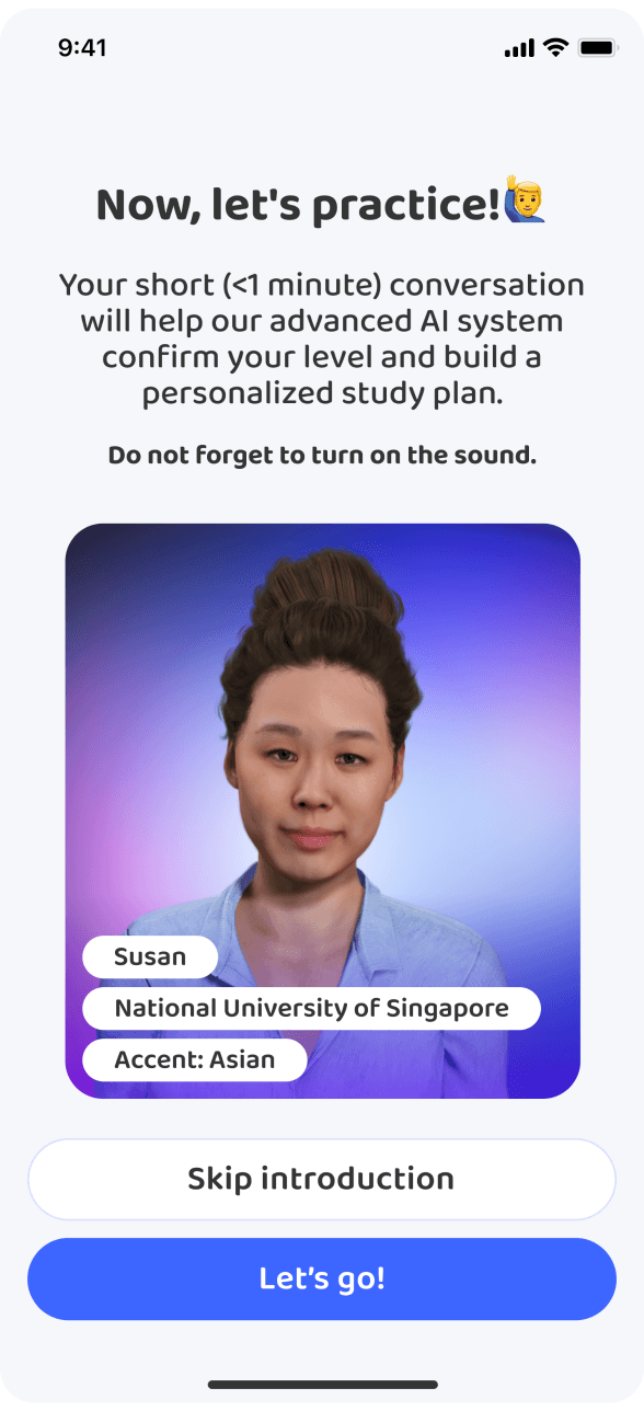 В начало онбординга был добавлен шаг с выбором нативного языка и возможностью переключить интерфейс. Это позволило снизить порог входа для пользователей, которые ещё не владеют английским,